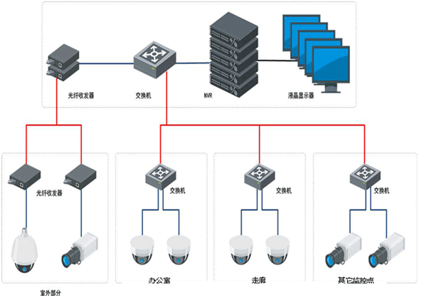 建设视频监控专网,室外摄像机部分采用光纤的方式传输,办公楼部分先通过接入交换机汇集后,采用光纤的方式传输到监控中心;办公楼内摄像机与交换机之间走线不超过80米,且保证不超过交换机传输能力;