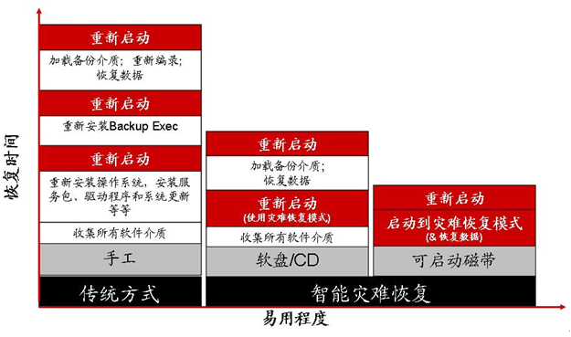 一些常见的情况-无论是相关的硬件问题、配置改变、应用程序故障、病毒攻击,还是恶意黑客攻击-都可以使企业的服务器瘫痪。如果服务器瘫痪了,那么至关重要的问题是在业务受到影响之前有多少时间来恢复数据与应用程序。传统的方法可能需要几个小时到几天来恢复服务器、重装软件、配置应用程序、设置用户,将您的系统恢复到正常状态-假设此过程没有其它错误出现的话。因此,很有必要简化这一高度复杂而且耗费大量精力的过程,满足企业对恢复时间目标的要求。