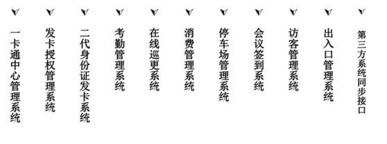 系统将成熟先进的非接触式智能技术、计算机技术、网络通讯技术相结合,将客户、卡片、读卡设备以及管理需求紧密联系在一起,实现一卡通行。通过一张智能卡,实现发卡授权、门禁、考勤、消费、停车场、访客、会议、出入口管理等功能。